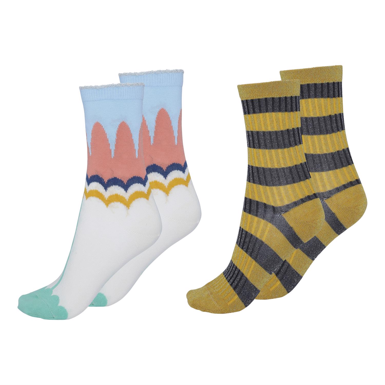 Två par strumpor. Ett par är med blommor och det andra paret är randigt.