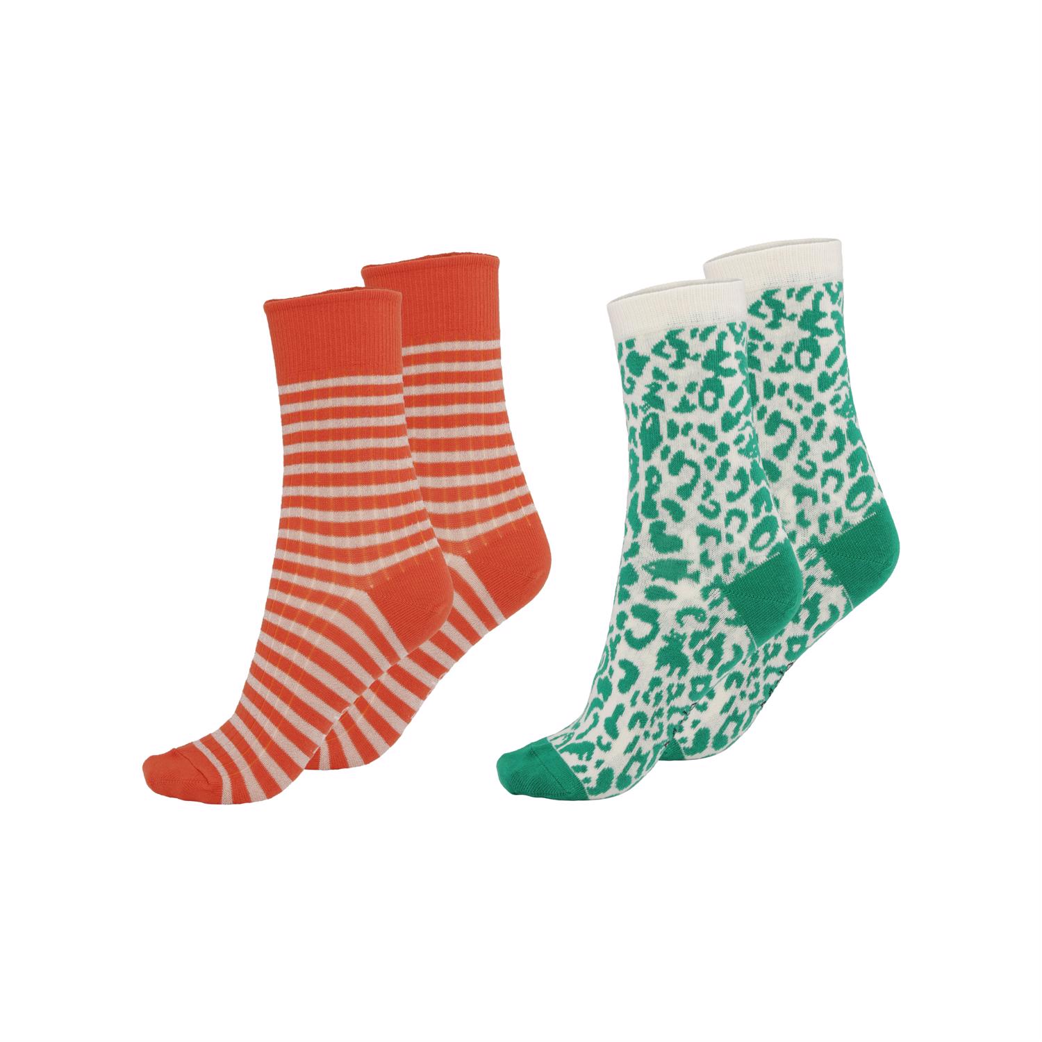 Två par strumpor. Ett par i grönt och vitt leopardmönster och det andra paret i rött med smala vita ränder.