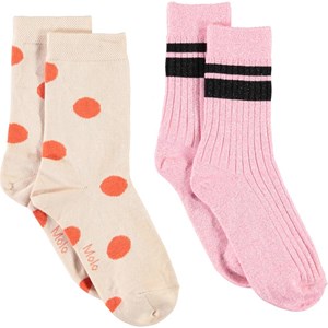 Två par strumpor. Det ena paret är rosa med svarta ränder och det andra paret är rosa med oranga prickar.