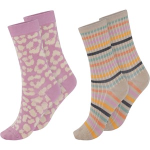 Två par strumpor i ribb. Det ena paret är ljuslila med leopardmönster och det andra med pasterllfärgade ränder.