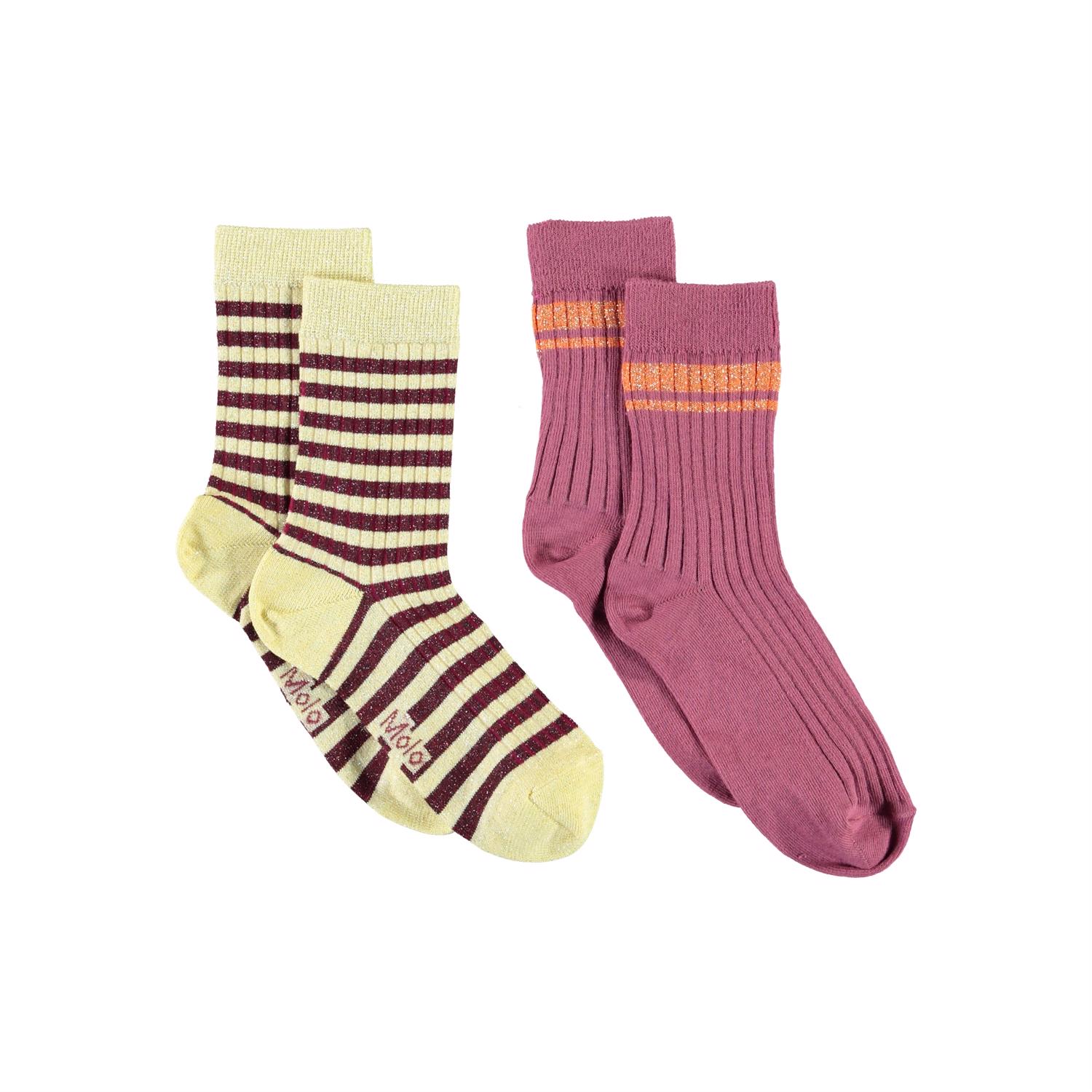 Två par strumpor. Det ena paret är mörkrosa med oranga ränder och det andra paret är gula med vinröda ränder.