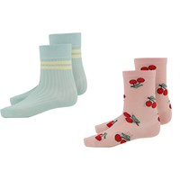 Två par strumpor. Det ena paret är i ribb och är vinrött med rosa gula ränder vid ankeln. Det andra paret är ljusblå med gula peacetecken hjärta på.