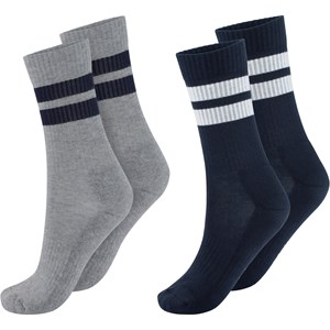Två par sportiga strumpor i ribb. Det ena paret är grå medan det andra är mörkblått och båda har vita ränder på skaftet.