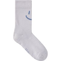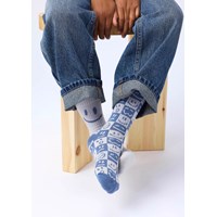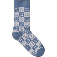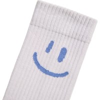 2-pack bomullsstrumpor. Strumporna har ribbat skaft och resår upptill, och är sköna och mjuka att bära. Förpackningen innehåller ett par blå och grårutiga med smileys i olika humör, samt ett par ljusgrå strumpor med en leende smiley framtill.