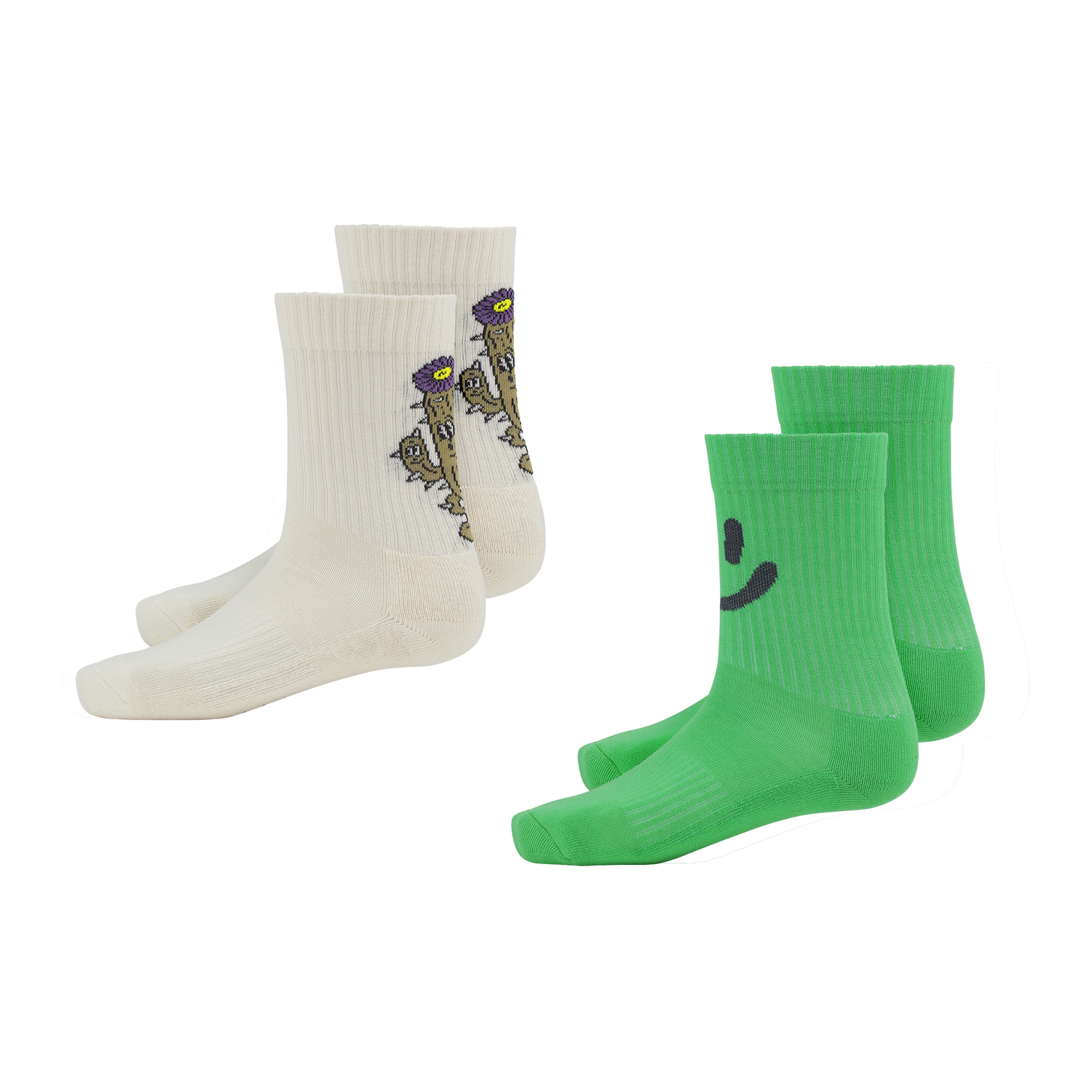 Två par sportiga strumpor i ribb. Det ena paret är vita med en cool kaktus på hälarna, medan det andra är gröna med smiley.