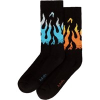 2-pack finstickade svarta strumpor i mjuk bomullsblandning med ribbad elastisk kant. Paketet innehåller ett par med blå/vita eldlågor och ett par med orange/gula eldlågor.