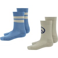 Två par sportiga strumpor i ribb. Det ena paret är blå med 2 beiga ränder på skaftet, medan det andra är beige med mörkblått peacetecken.