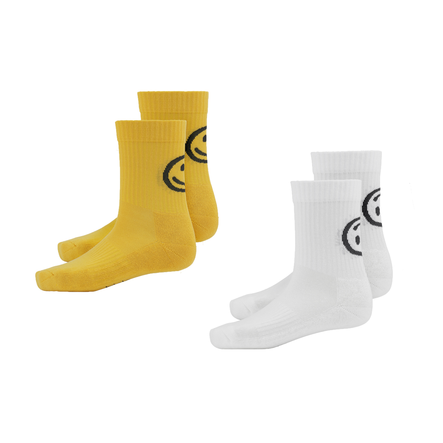 Två par sportiga strumpor i ribb. Det ena paret är gula och det andra vita med en stor smiley på skaftet.