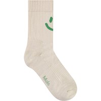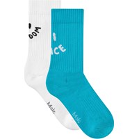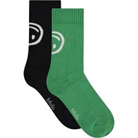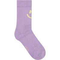 2-pack bomullsstrumpor. Strumporna har muddar och resår upptill, och de är underbart mjuka att bära. Förpackningen innehåller ett par beige strumpor med en grön smiley och ett par lila strumpor med en gul smiley.
