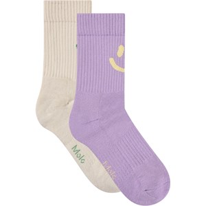 2-pack bomullsstrumpor. Strumporna har muddar och resår upptill, och de är underbart mjuka att bära. Förpackningen innehåller ett par beige strumpor med en grön smiley och ett par lila strumpor med en gul smiley.