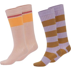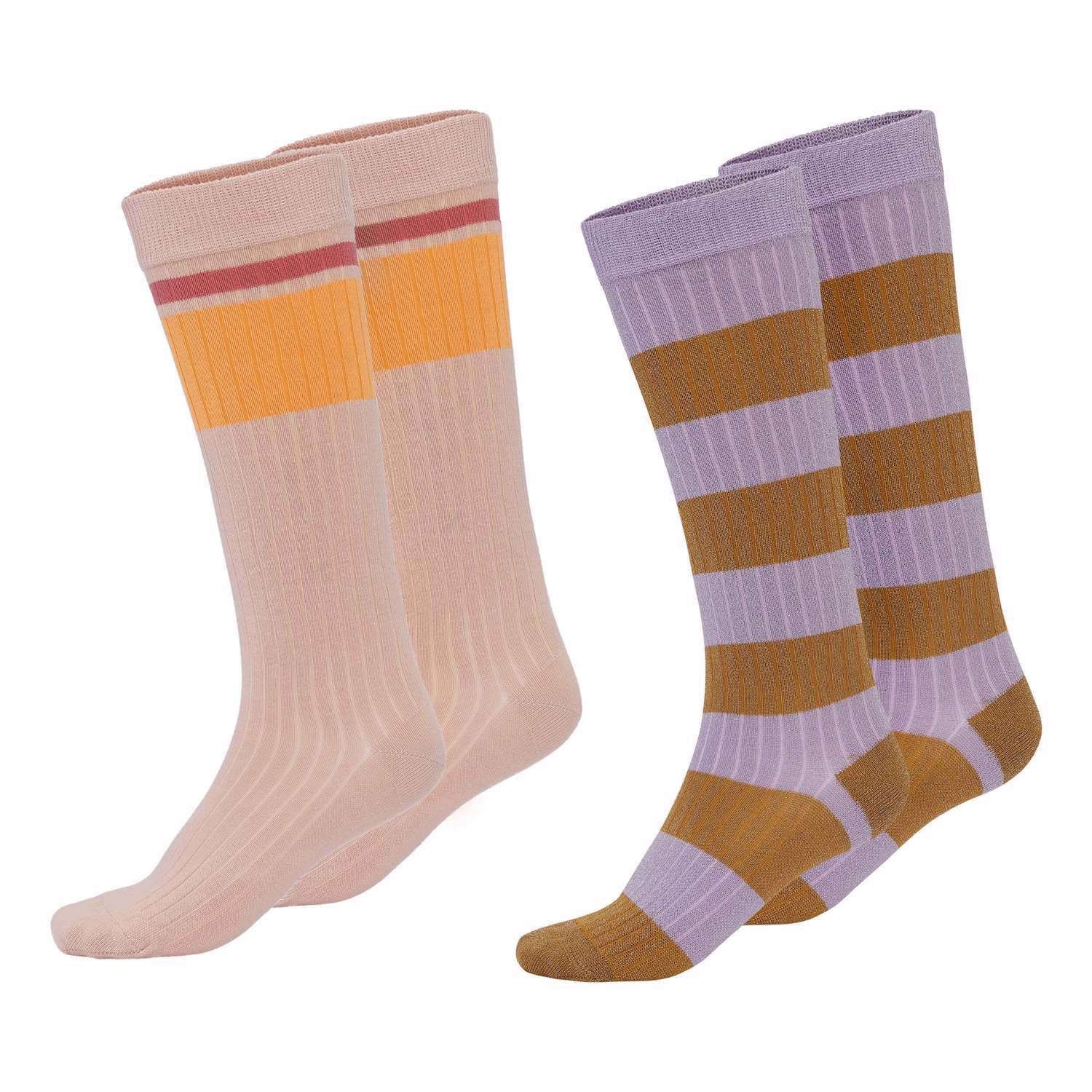 Två par långa strumpor. Det ena paret är rosa med en bred och en smal rand och det andra är brunt- och lilarandigt.