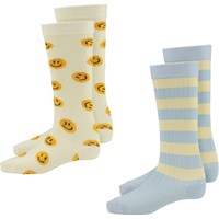 Två par långa strumpor. Det ena paret är ljusgula med gula smileys, medan det andra är ljusblått med ljusgula ränder.