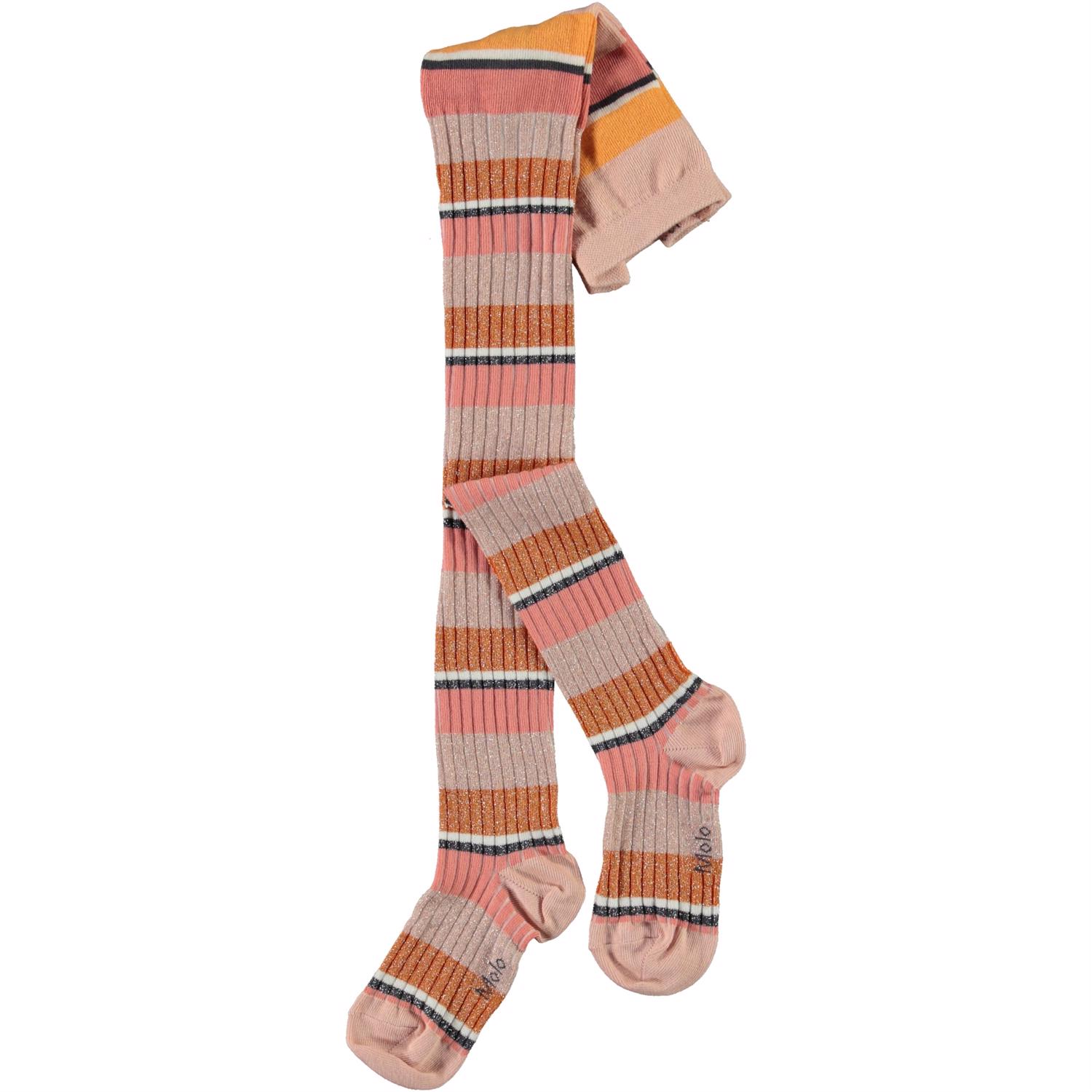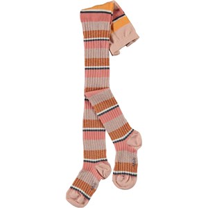 Strumpbyxor med breda och smala ränder i orange och olika nyanser av rosa. Tightsen är ribbade och glittriga.