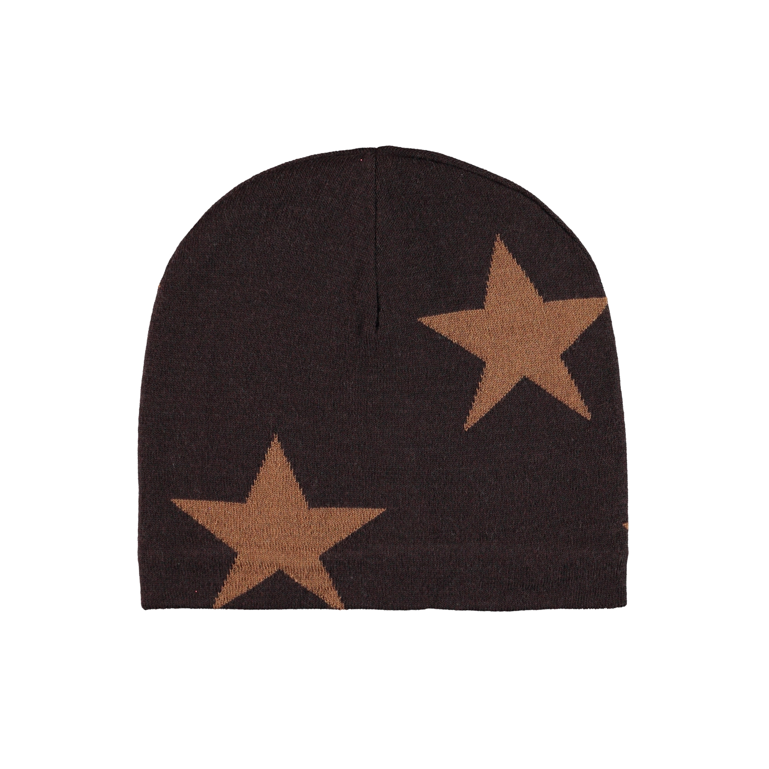 Mörkbrun stickad mössa i en mjuk ullmix med instickade stjärnor och ribbkant nertill.