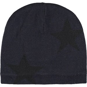 Mörkblå stickad mössa i en mjuk ullmix med instickade stjärnor och ribbkant nertill.