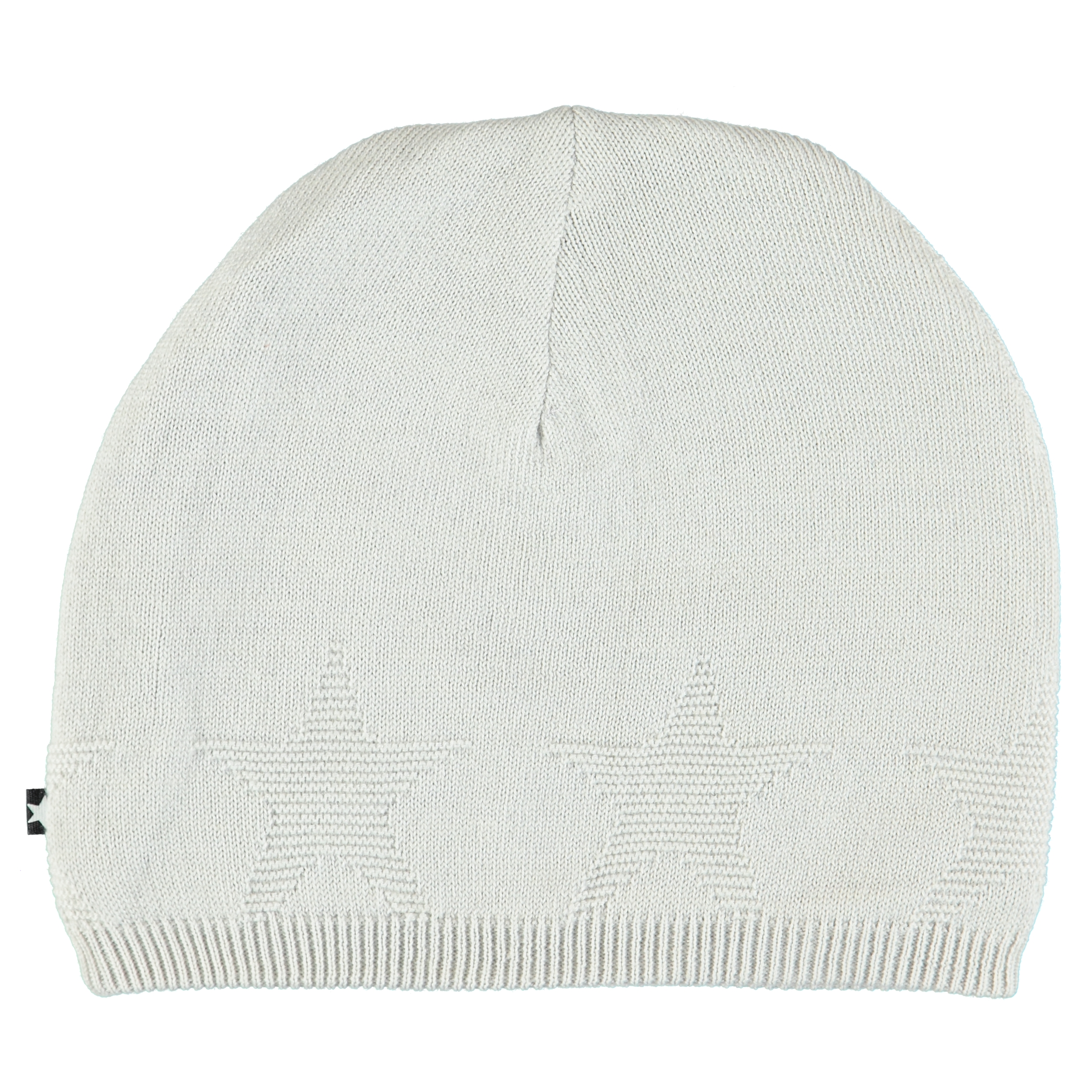 Ljusgrå mössa i en mjuk ullblandning med stickade stjärnor och ribbkant nedtill.
