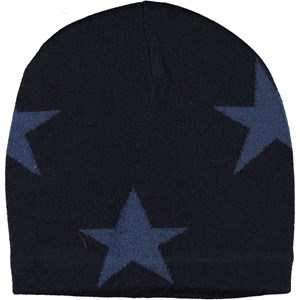 Blå stickad mössa med instickade stjärnor. Mössan är tillverkad i en mjuk ullmix och har ribbkant nertill.