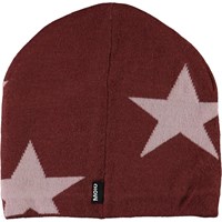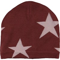 Mörkröd mössa i mjuk ullmix med kontrastfärgade stjärnor och ribbad kant.