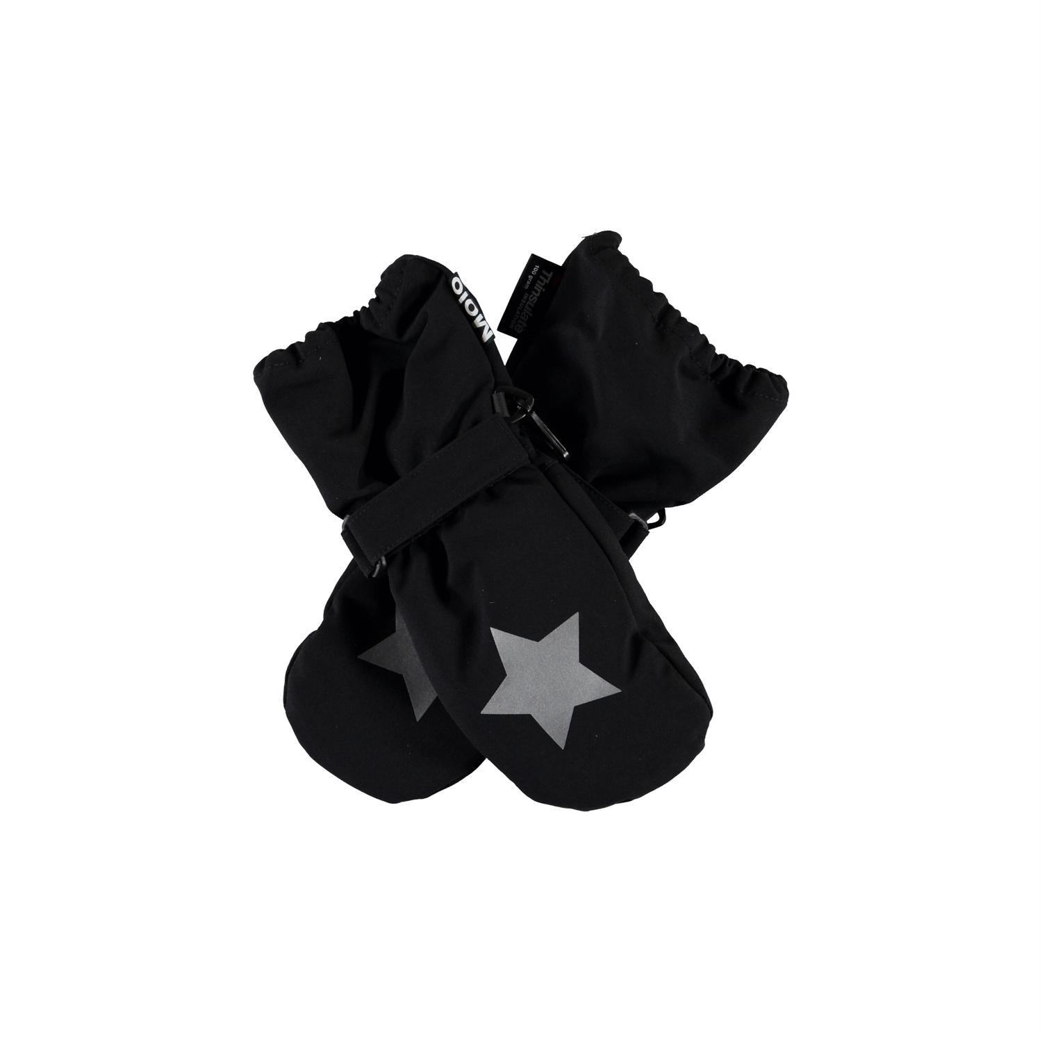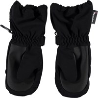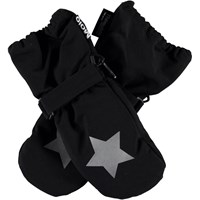 Svarta, vattentäta vantar med 3M™ Thinsulate™ isolering, med bra andningsförmåga. Vantarna har stjärnreflexer framtill, samt en elastisk, justerbar kant vid handleden. Notera att skaftet på denna modell är en aning längre än på Mitzy, för att undvika ett mellanrum vid jackans ärmslut. Produkten har en vattenavvisande PFC-fri impregnering (innehåller exempelvis inte PFOS, PFOA och liknande). Vattenpelare: 10.000 mm. Andningsförmåga: 8.000 g/m2/24t. Observera från storlek 1-2 år, handskarna har en dragkedja i axeln istället för kardborreband.