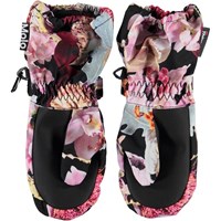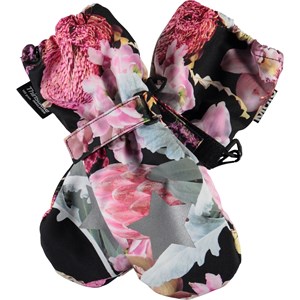 Blommiga, vattentäta vantar med 3M™ Thinsulate™ isolering, med bra andningsförmåga. Vantarna har stjärnreflexer framtill, samt en elastisk, justerbar kant vid handleden. Notera att skaftet på denna modell är en aning längre än på Mitzy, för att undvika ett mellanrum vid jackans ärmslut. Produkten har en vattenavvisande PFC-fri impregnering (innehåller exempelvis inte PFOS, PFOA och liknande). Vattenpelare: 10.000 mm. Andningsförmåga: 8.000 g/m2/24t. Observera från storlek 1-2 år, handskarna har en dragkedja i axeln istället för kardborreband.