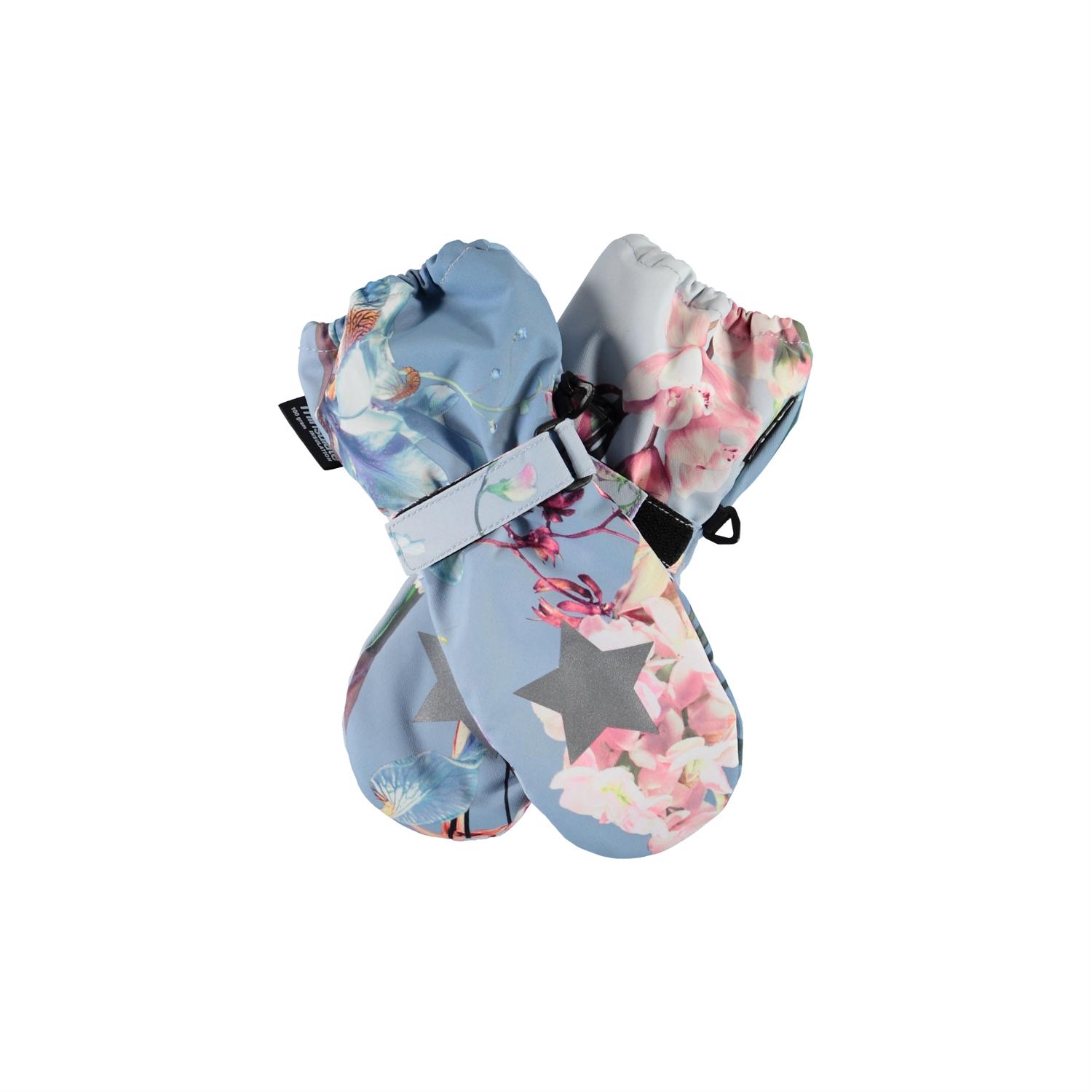 Blommiga, vattentäta vantar med 3M™ Thinsulate™ isolering, med bra andningsförmåga. Vantarna har stjärnreflexer framtill, samt en elastisk, justerbar kant vid handleden. Notera att skaftet på denna modell är en aning längre än på Mitzy, för att undvika ett mellanrum vid jackans ärmslut. Produkten har en vattenavvisande PFC-fri impregnering (innehåller exempelvis inte PFOS, PFOA och liknande). Vattenpelare: 10.000 mm. Andningsförmåga: 8.000 g/m2/24t. Observera från storlek 1-2 år, handskarna har en dragkedja i axeln istället för kardborreband.