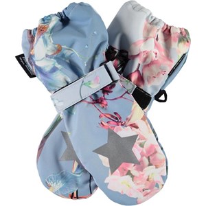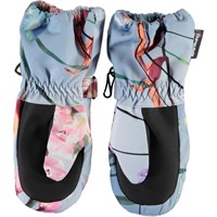 Blommiga, vattentäta vantar med 3M™ Thinsulate™ isolering, med bra andningsförmåga. Vantarna har stjärnreflexer framtill, samt en elastisk, justerbar kant vid handleden. Notera att skaftet på denna modell är en aning längre än på Mitzy, för att undvika ett mellanrum vid jackans ärmslut. Produkten har en vattenavvisande PFC-fri impregnering (innehåller exempelvis inte PFOS, PFOA och liknande). Vattenpelare: 10.000 mm. Andningsförmåga: 8.000 g/m2/24t. Observera från storlek 1-2 år, handskarna har en dragkedja i axeln istället för kardborreband.