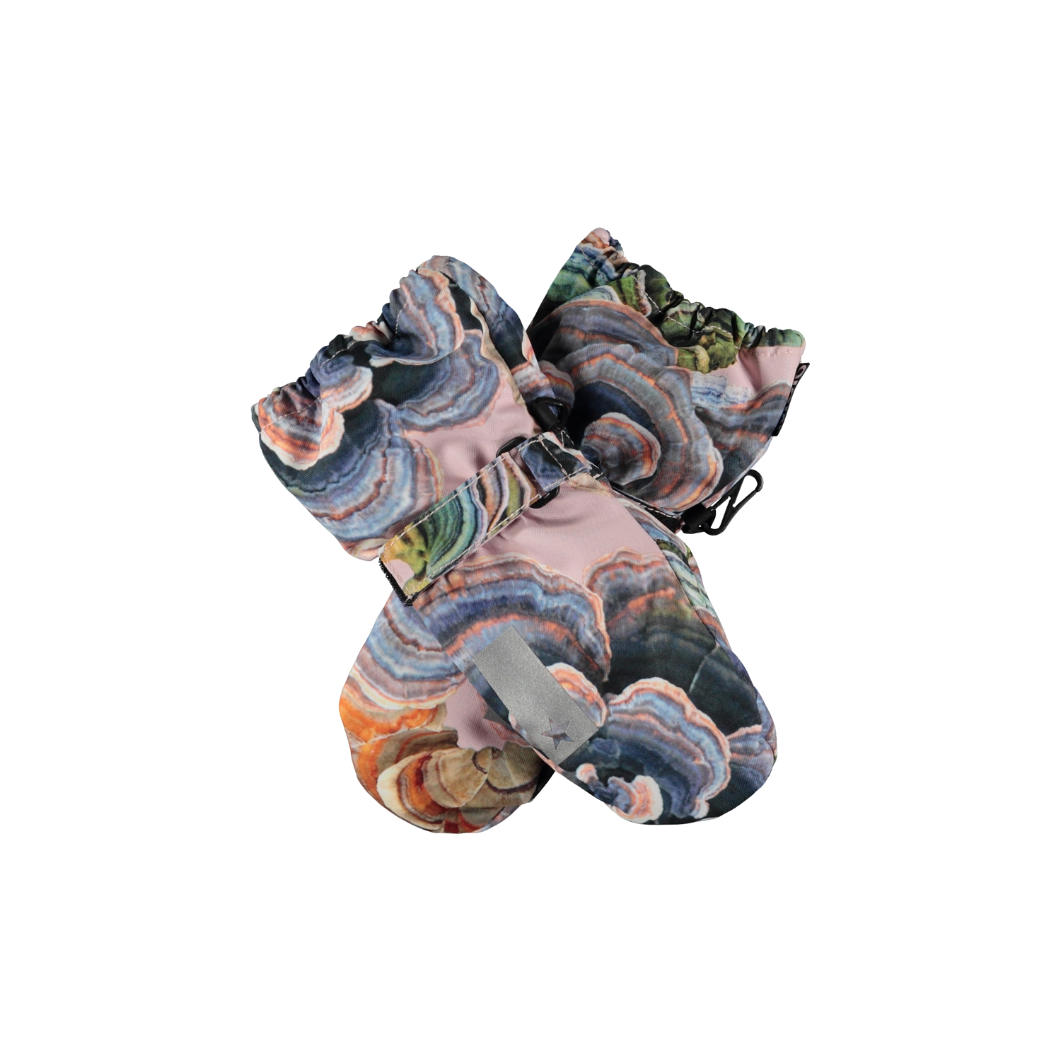 Lyserøde vinterhandsker med print af farverige svampe. På indersiden af handsken og ved tommelfingeren er der sorte gummibelægninger, der giver en god gribehåndflade. Handskerne egner sig godt til alt slags vejr og er perfekte både til hverdagen eller skiferien. Derudover matcher handskerne med Molo’s overtøj i farver og print. Skaftet på denne model er en smule længere end på Mitzy, så der ikke kommer en åbning ved jakkeærmet. Bemærk at str. 1-2 år har lynlås i skaftet i stedet for velcrolukning.