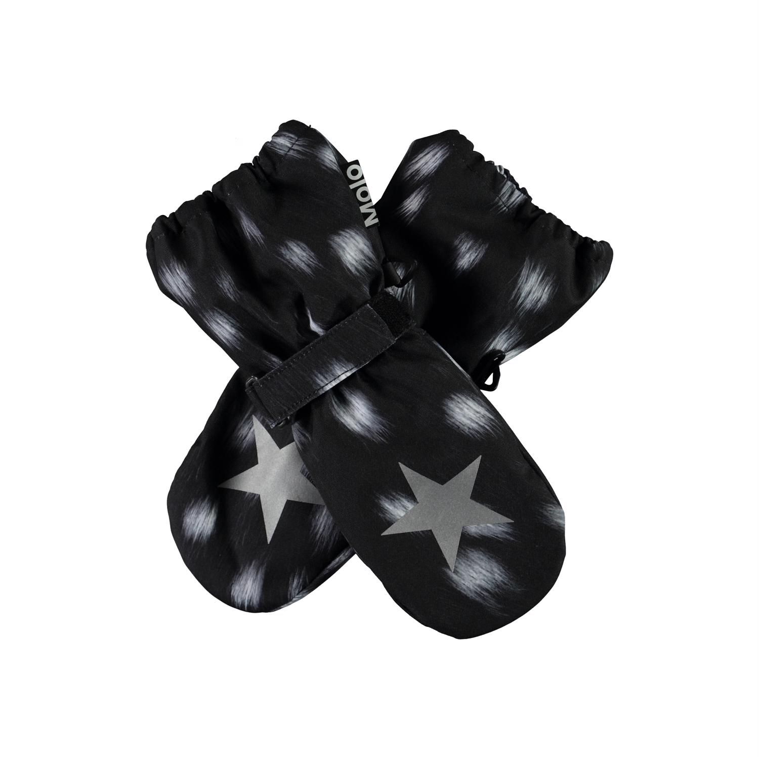 Vattentäta vantar med bra andningsförmåga och 3M Thinsulate isolering. Vantarna är svarta med vita fläckar, har en stjärnreflex på ovansidan samt gummiband och justerbar velcro vid handleden. Yttermaterialet är 51% återvunnet, tillverkat av återvunnen polyester. Notera att skaftet på denna modell är något längre än på Mitzy, på det sätt att det inte blir en öppning vid ärsmlut.Vantarna har en vattenavvisande PFC-fri impregnering (innehåller t.ex. inte PFOS, PFOA och liknande). Vattenpelare: 10.000 mm. Andningsförmåga: 8.000 g/m2/24t.