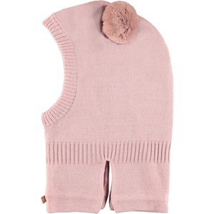 Rosa stickad balaklava i ullmix. Mössan har små fuskpälsbollar som öron.