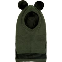 Mörkblå stickad balaklava med fuskpälsbollar. Den har slitsar på sidorna av nacken så den passar bra över bröstet och axlarna. Den är tillverkad i en mjuk ullblandning och fodrad med plyschtyg.