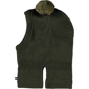 Mörkgrön stickad balaklava i ullmix. Mössan har små fuskpäls pom- poms som öron.