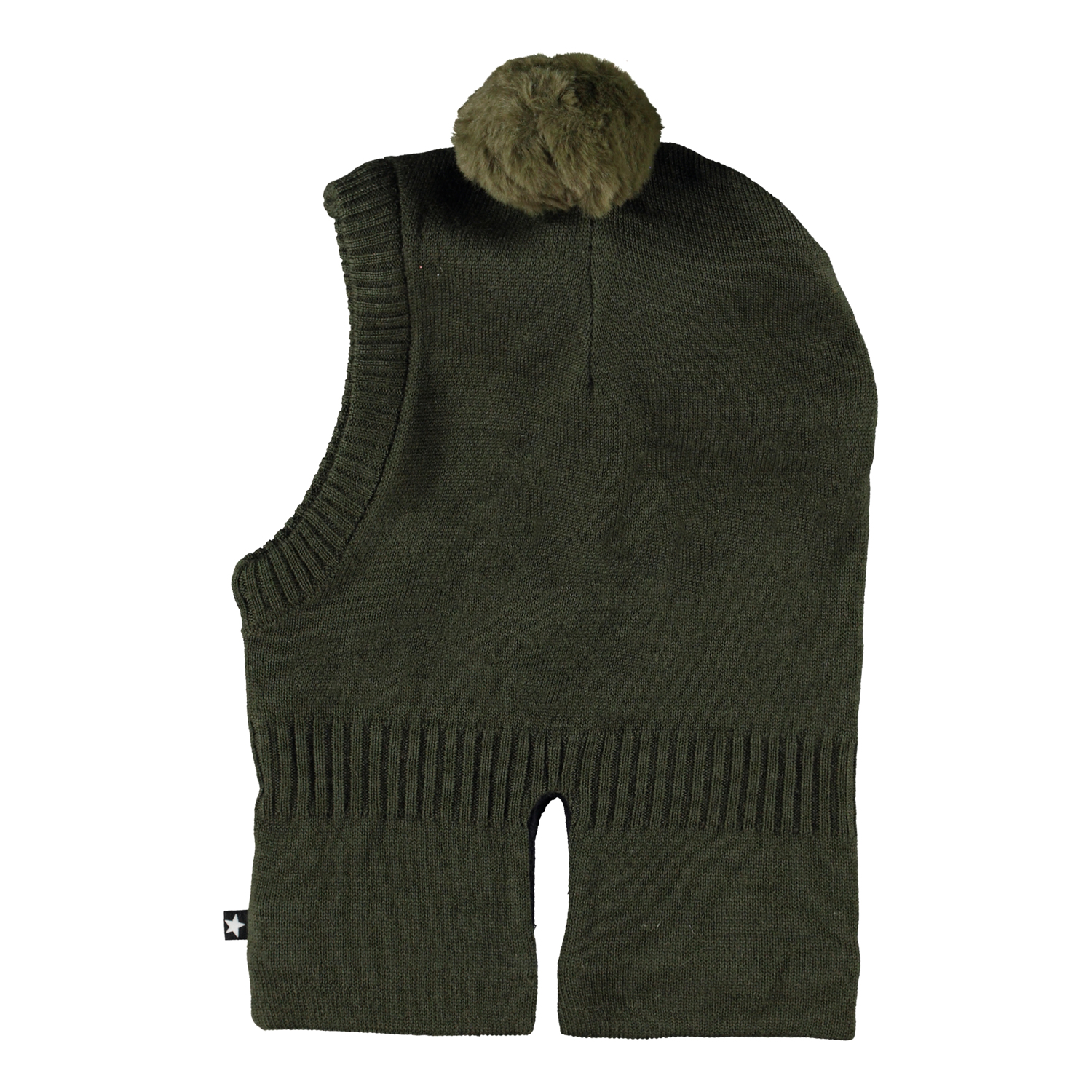 Mörkgrön stickad balaklava i ullmix. Mössan har små fuskpäls pom- poms som öron.