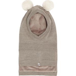 Grå stickad balaklava med fuskpälsbollar. Den har slitsar på sidorna av nacken så att den passar bra över bröstet och axlarna. Den är tillverkad i en mjuk ullblandning och fodrad med plyschtyg.
