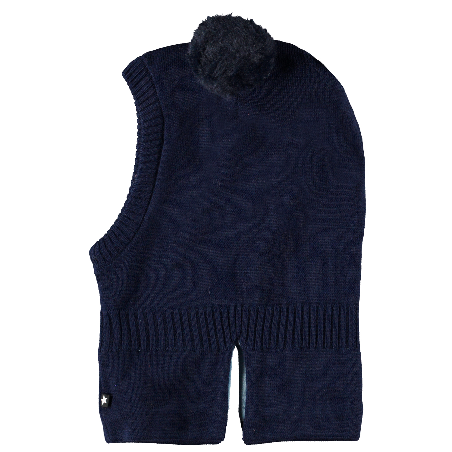 Mörkblå stickad balaklava i ullmix. Mössan har små fuskpäls pom- poms som öron.