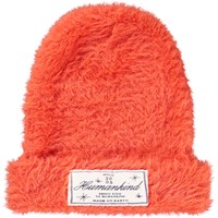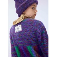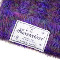 Lila fluffig mössa med flerfärgat garn, uppvik och ett emblem framtill med texten 'Mänskligheten - Att vara snäll mot mänskligheten'.