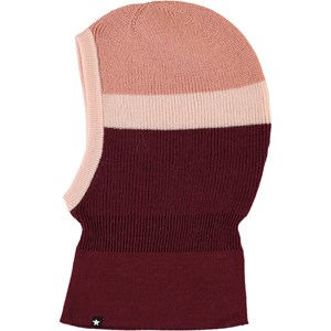 Vinröd och rosa, stickad balaklava med brun kant runt ansiktet.
