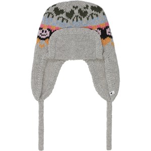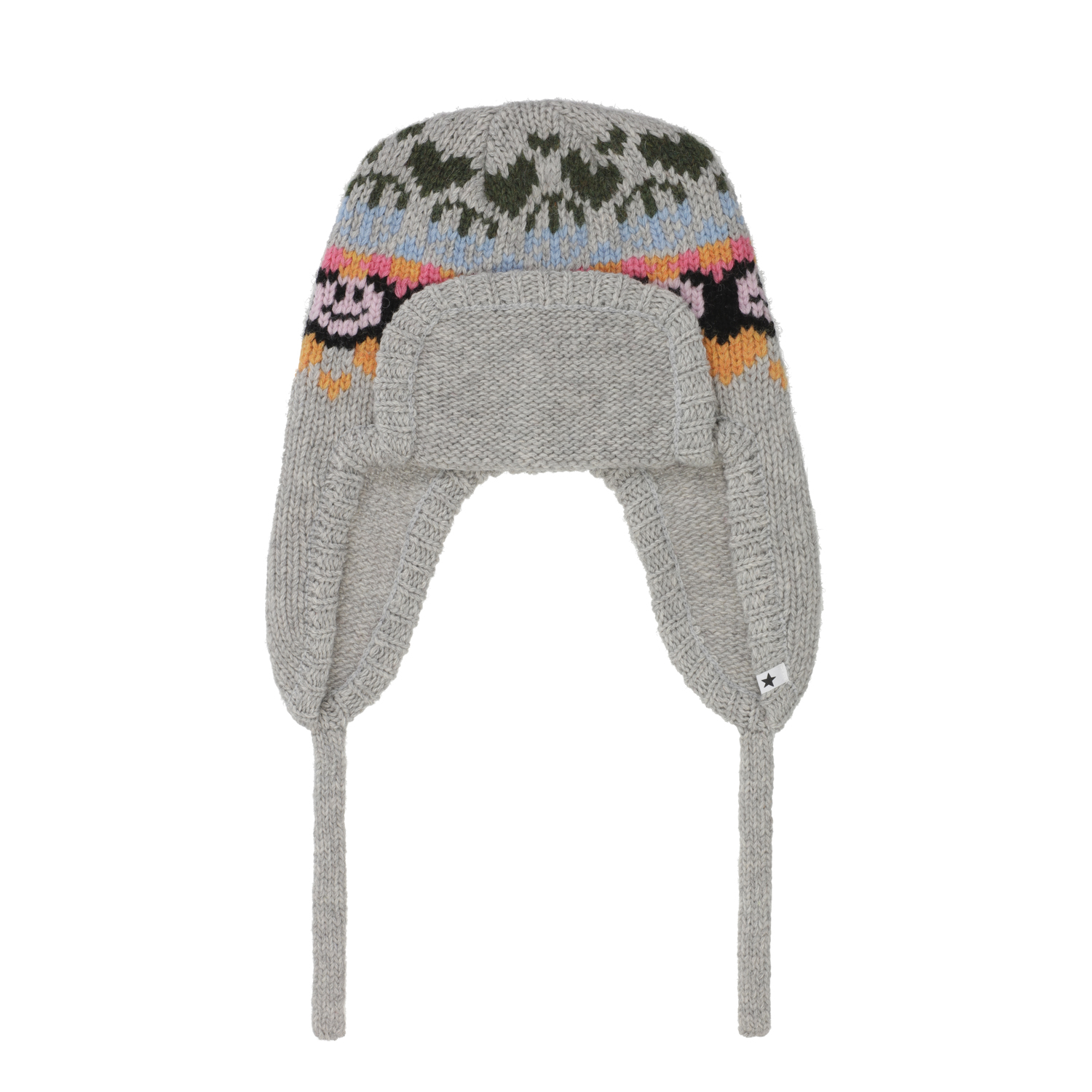 Grå stickad mössa med smileys. Mössan har lappar som går ner över öronen och kan bindas under hakan, så den sitter bra fast.