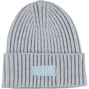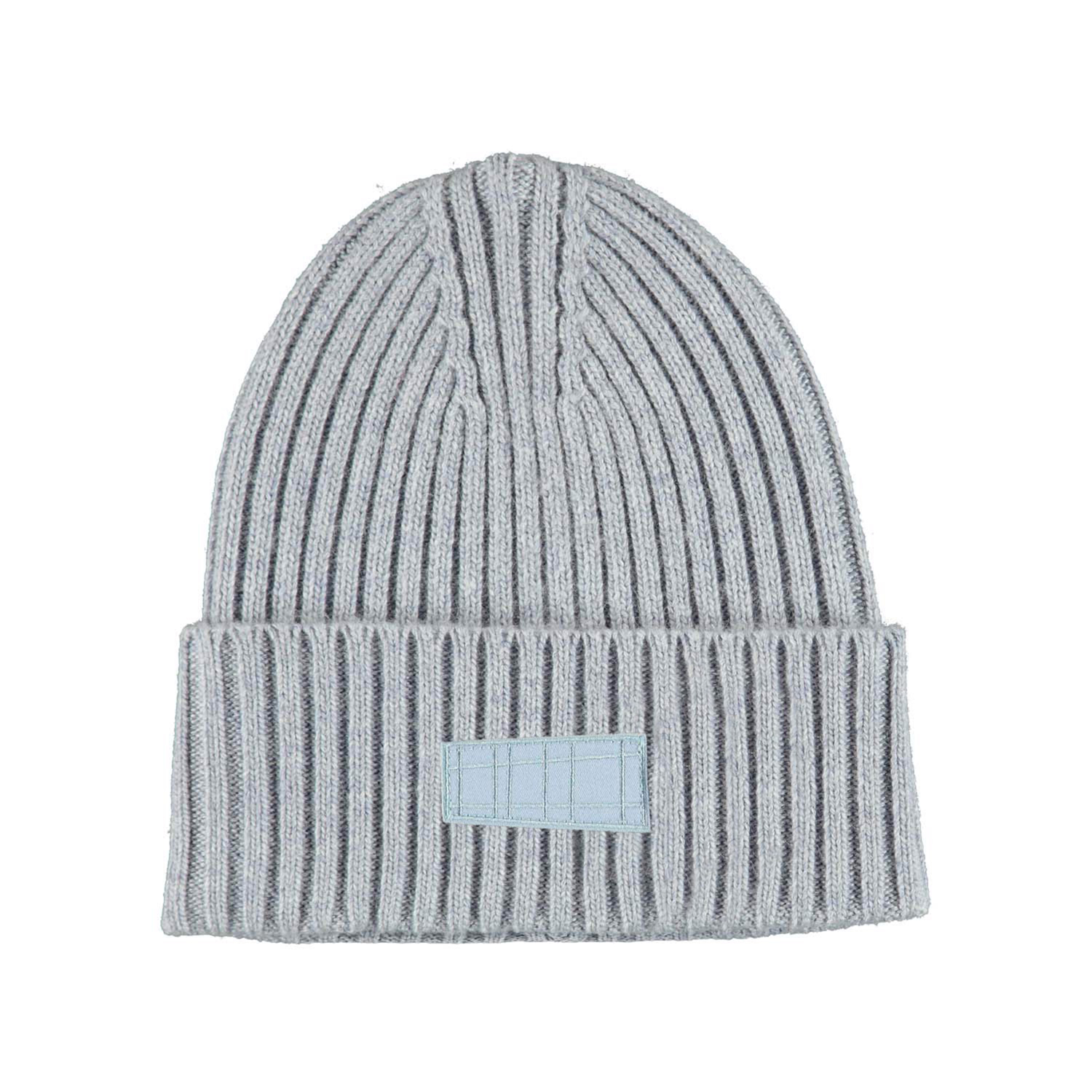 Kabelstickad ljusblå mössa i ullmix med uppvik nertill och Molo´s logga framtill.
