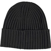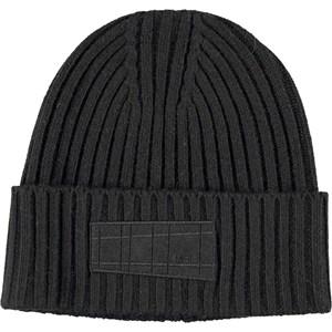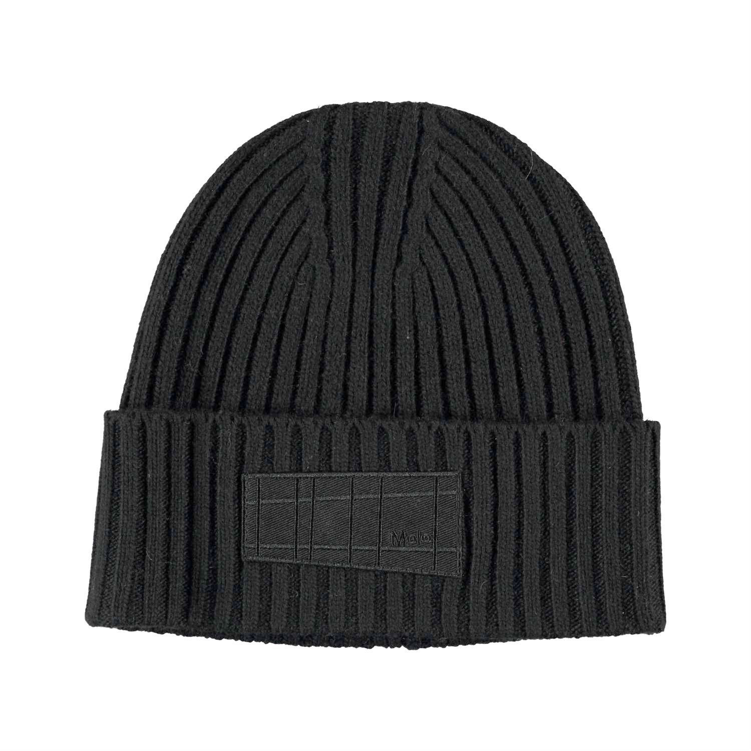 Kabelstickad svart mössa i ullmix och en uppvikbar kant, samt Molos nya etikett.