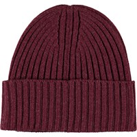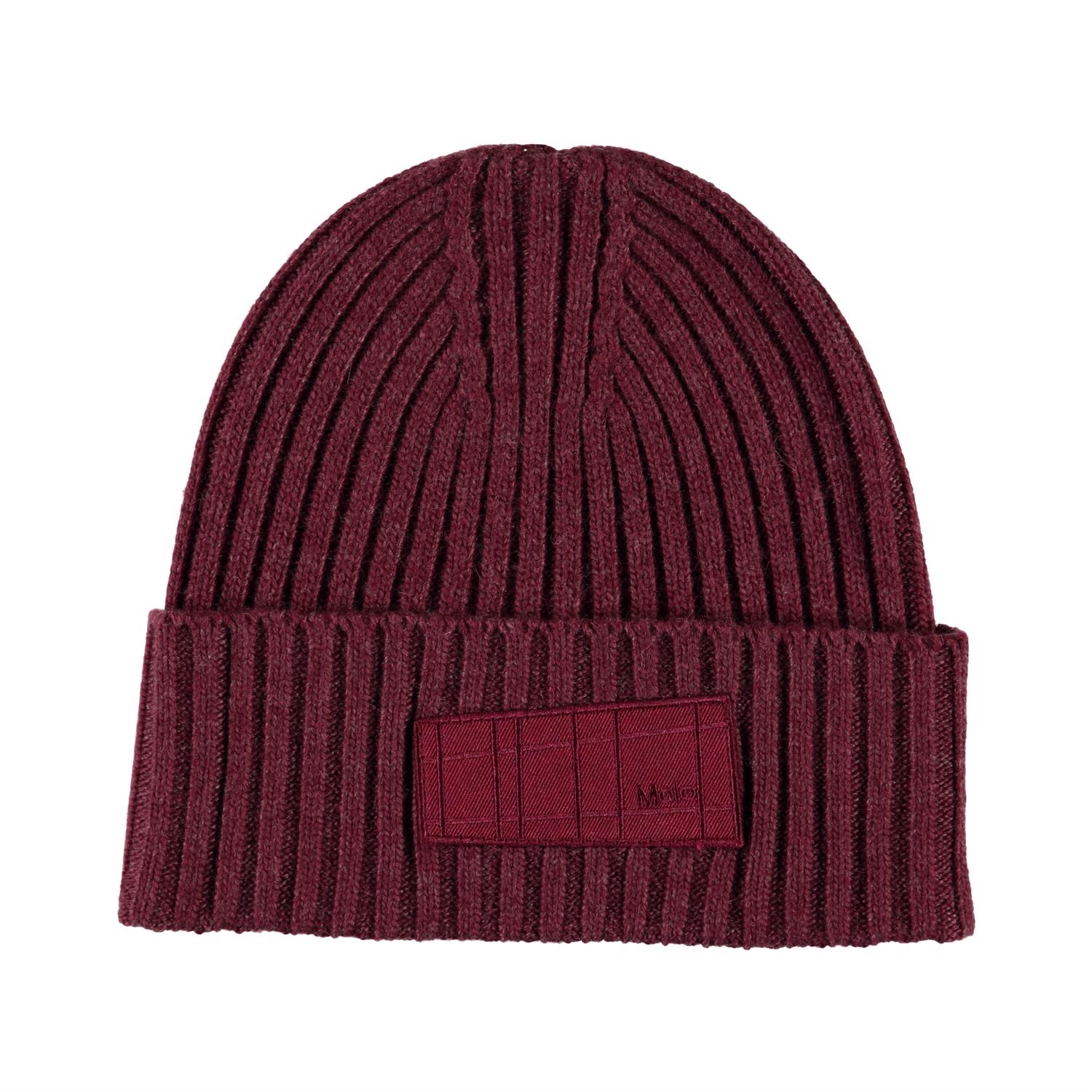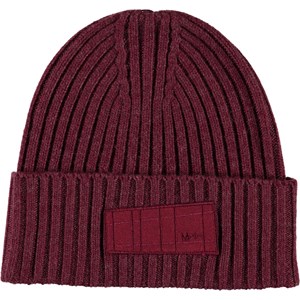 Kabelstickad vinröd mössa i ullmix och en uppvikbar kant, samt Molos nya etikett.
