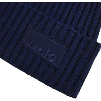 Mörkblå stickad mössa med uppvik och Molos logotyp framtill.