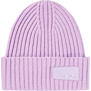Lila ribbstickad mössa med uppvik och Molos logotyp framtill.