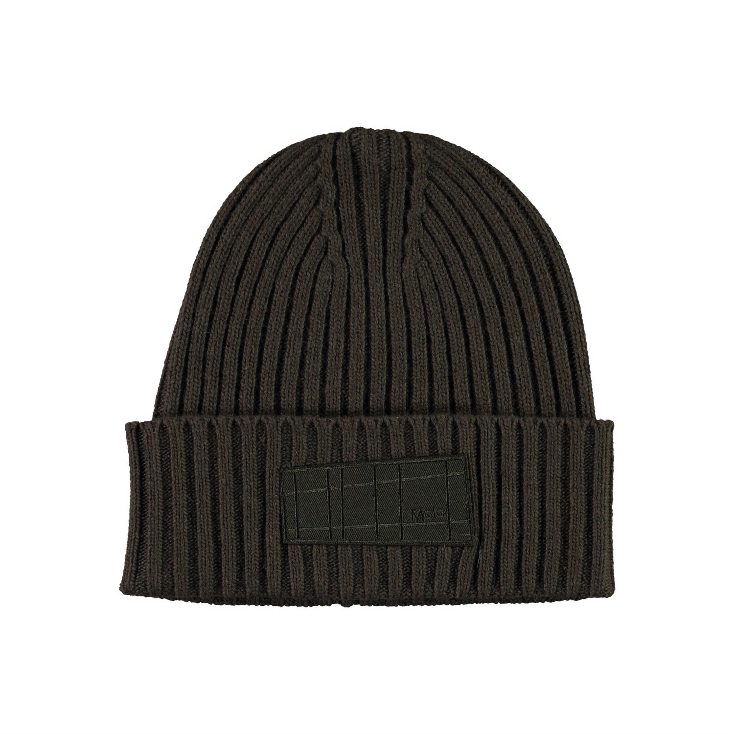 Kabelstickad grön mössa i ullmix med uppvik nertill och Molos logga framtill.