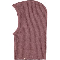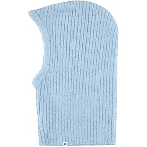 Blå stickad balaklava som värmer både ansikte, kinder och hals.