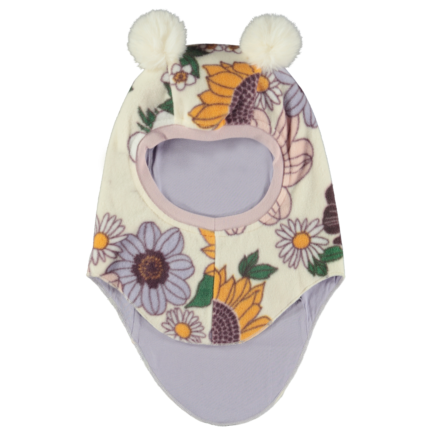 Hvid elefanthue med blomsterprint og pomponer. Huen er fremstillet i blød fleece og er perfekt til at holde både hals og ører varme på kølige dage.