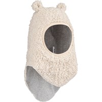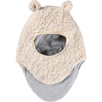 Krämfärgad balaklava med söta teddybjörnsöron för de små. Balaklavan är gjord av mjuk teddyfleece och är perfekt för att hålla både nacke, huvud och öron varma på kalla dagar. Balaklavan är fodrad med mjukt grått jerseyfoder.