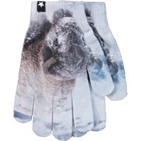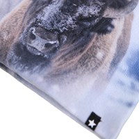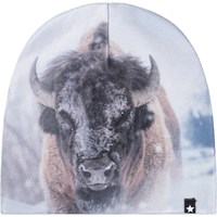 Blått set med en mössa och fingerhandskar med bisontryck. Storlek S/M 3-6 år. Storlek M/L 7-12 år.