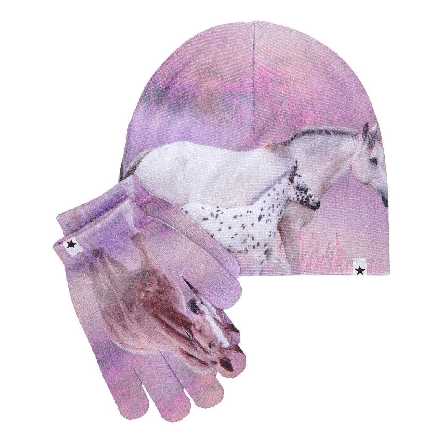 Set med mössa och fingervantar med hästmönster. Storlek S/M passar barn i åldrarna 3-6 år, medan storlek M/L passar barn i åldrarna 7-12 år.