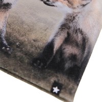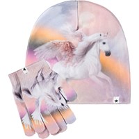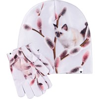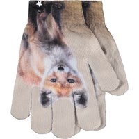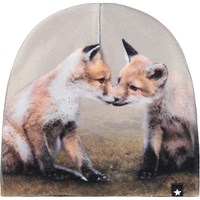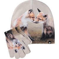 Beige set med en mössa och fingerhandskar med tryck av rävungar. Storlek S/M 3-6 år. Storlek M/L 7-12 år.
