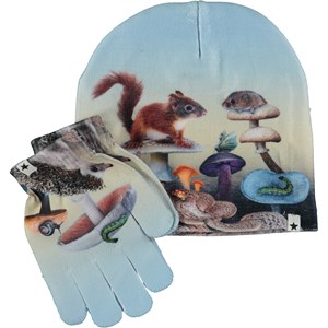 Matchande set med mössa och vantar i ljusblå med skogens svampar och djur. Storlek S/M 3-6 år. Storlek M/L 7-12 år.